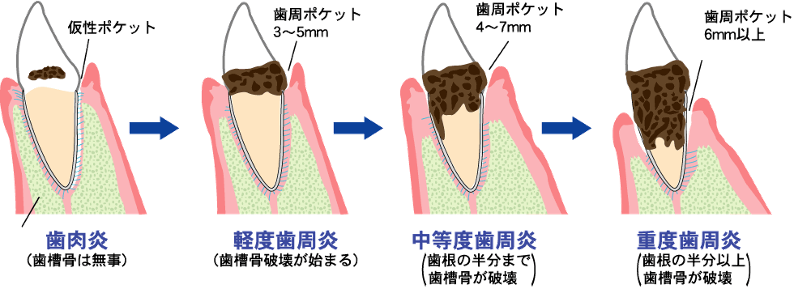 歯と歯ぐきはぴったりくっついているように見えますが、実はその境目に溝があり、「歯周ポケット」といいます。歯周ポケットの深さが2mm以下なら問題はございませんが、深くなると汚れがたまりやすくなり、その中で歯周病菌が繁殖しやすくなります。中等/重度歯周炎になれば、歯を支える土台である歯槽骨が溶けつつあり、最後に歯が抜け落ちてしまいます。 定期検診での歯周組織検査により歯周病を予防しましょう。